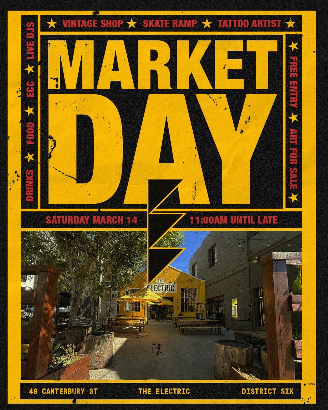 Vintage finds, live DJs, drinks, food, tattoos, skate ramp & local art.